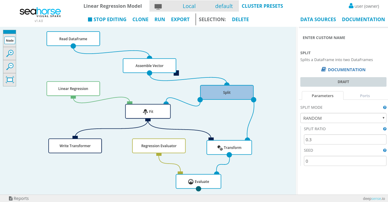 Seahorse可以连接任何的Spark集群(YARN,Mesos,Spark Standalone),或者是本地的spark。当处理本地文件时,Seahorse封装了一些库,可以方便处理。Seahorse支持Spark ML算法,并允许使用Python或R自定义操作。